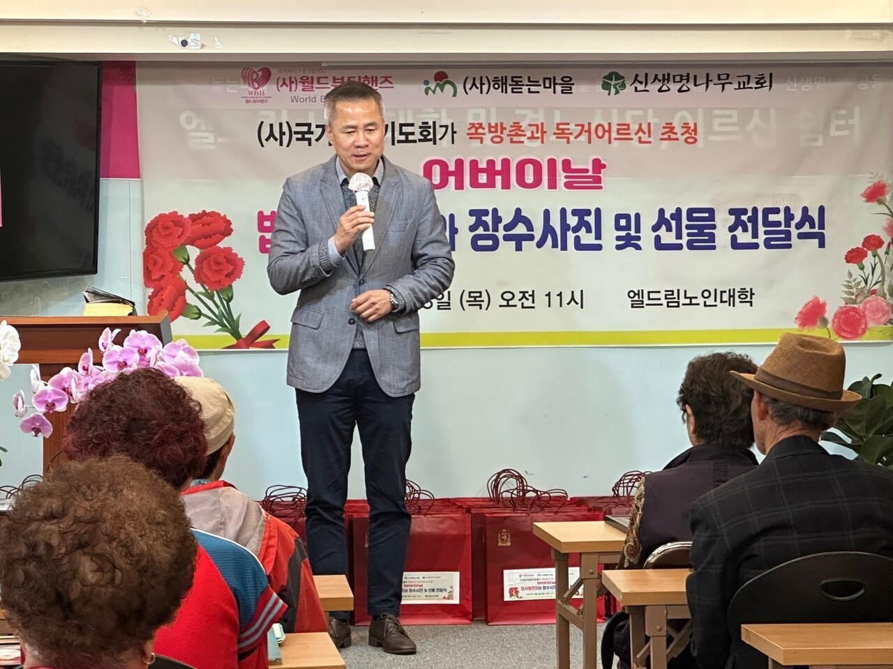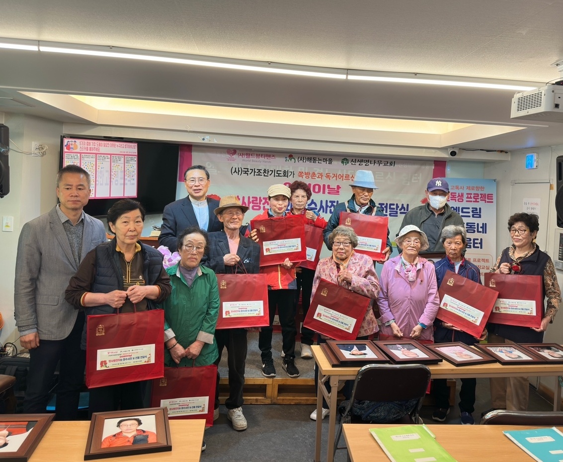 (사)국가조찬기도회(회장 이봉관 장로)는 쪽방촌과 독거어르신을 위한 ‘어버이날 밥사랑 잔치와 장수사진 및 선물전달식’을 지난 5월 8일 서울시 마포구에 소재한 엘드림노인대학에서 가졌다.