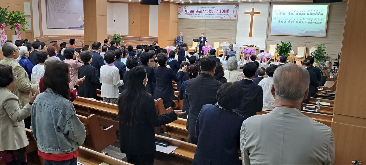 이에 김영희 총회장은 “하나님의 은혜로 부족한 제가 제59회 총회장의 직분을 맡게 되었다. 먼저 저를 믿어주시고 기도와 사랑으로 함께해 주신 모든 동역자 목사님들과 성도님들께 깊이 감사드린다”며, “저의 힘이 아니라 오직 하나님의 은혜와 여러분의 기도로 이 자리에 서 있음”을 고백했다.